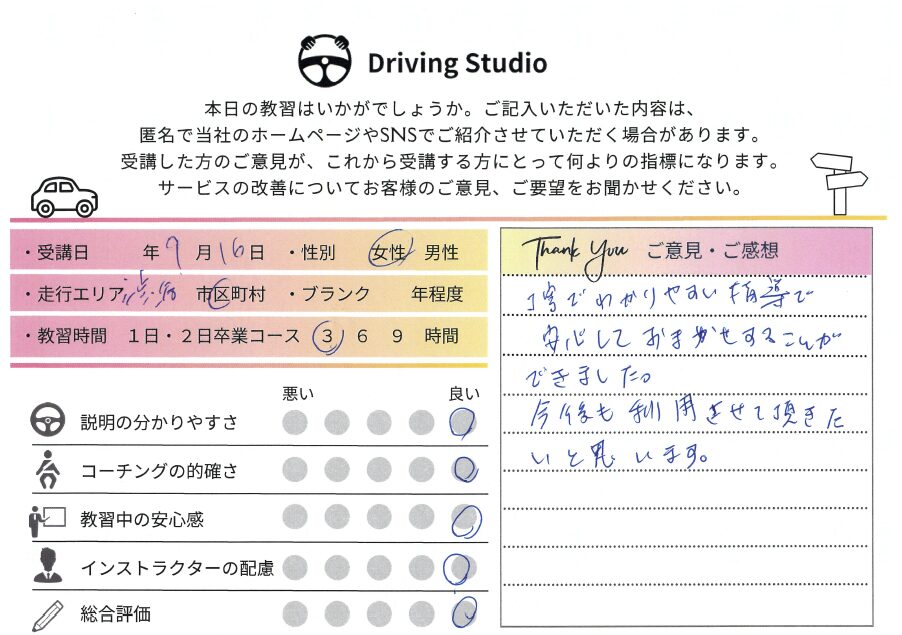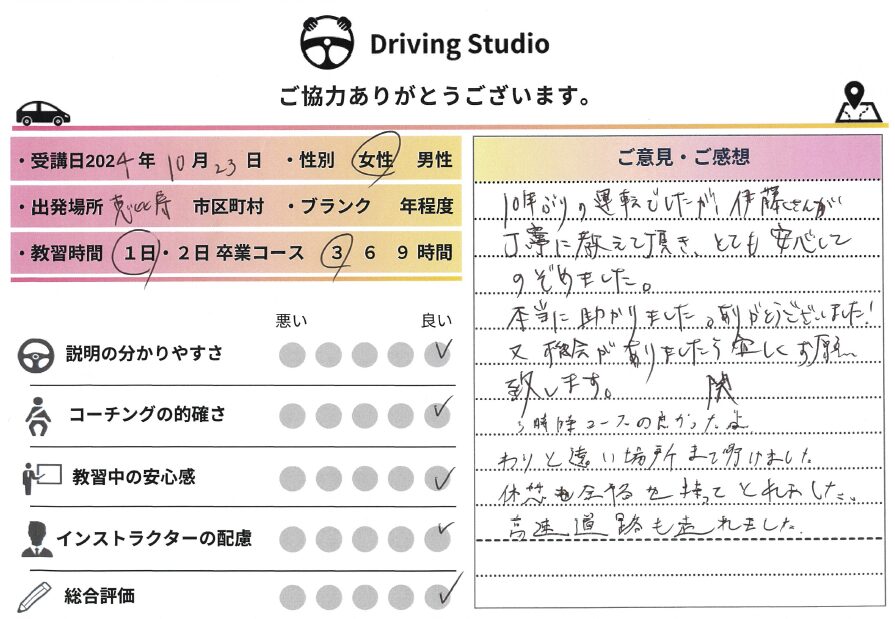 10年ぶりの運転でしたが、伊藤さんが丁寧に教えて頂き、とても安心してのぞめました。本当に助かりました。ありがとうございました。又機会がありましたら楽しくお願い致します。3時間コースの良かった点は割と遠い場所まで行けました。休憩も余裕を持ってとれました。高速道路も走れました。