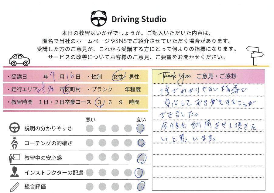 丁寧で分かりやすい指導で安心してお任せすることができました。今後も利用させて頂きたいと思います。