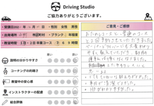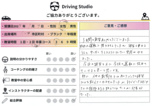 3時間の教習ありがとうございました。始めは運転に慣れませんでしたが、練習を重ねるうちに少しずつできるようになっていく実感がわきました。今回の練習を基に今後の運転に役に立てていけると良いと思います。特に他の教習所ではあまりバック練習などを教えてくれませんでしたが。ドライビングスタジオさんは積極的に教えてくれたのが印象的でした。