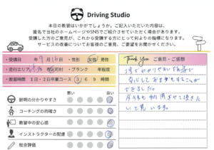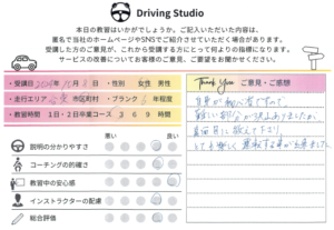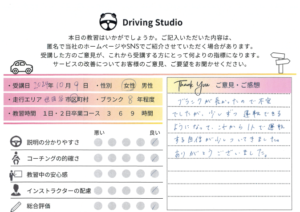 ブランクが長かったので不安でしたが、少しずつ運転できるようになってこれから1人で運転する自信が少しついてきました。ありがとうございました。