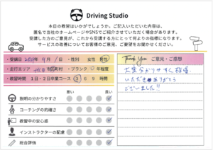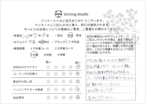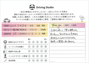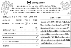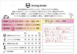 かなり緊張していましたが、雑談などまじえて指導して下さり、リラックスして運転できました。駐車も苦手だったのですが、色んなパターンで何回も練習できて自信がもてました。また、期間があいてしまったときはぜひお願いしたいです!ありがとうございました。
